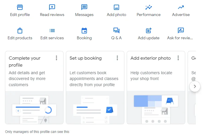 Now that you have your profile active, if you search on Google for the name of your business or service that you used to create your profile, your profile will appear alongside many options. To be able to see analytics on your profile, which is extremely important to know if it is reaching people and they are finding it, go to Performance and you will have all the data available.